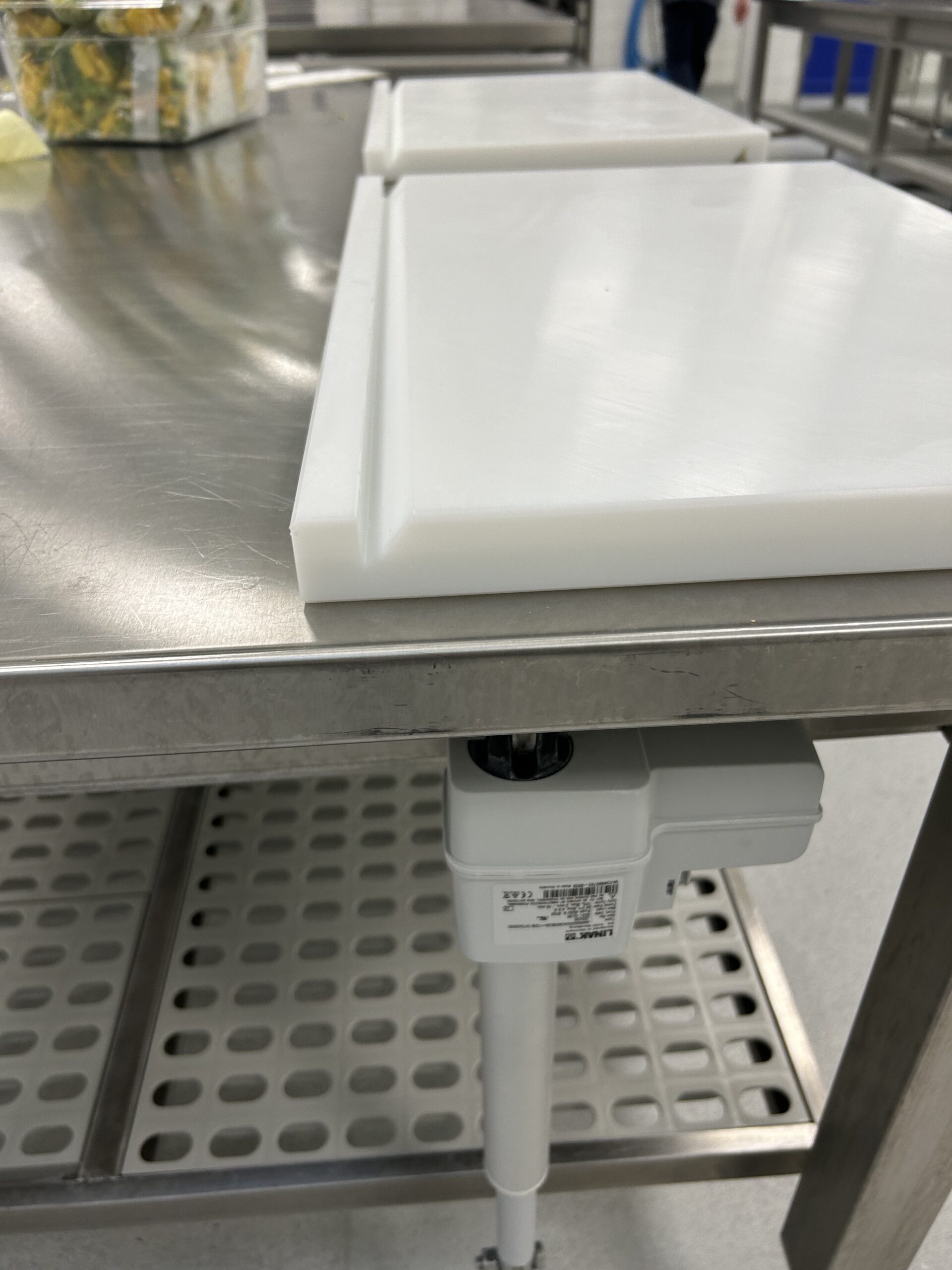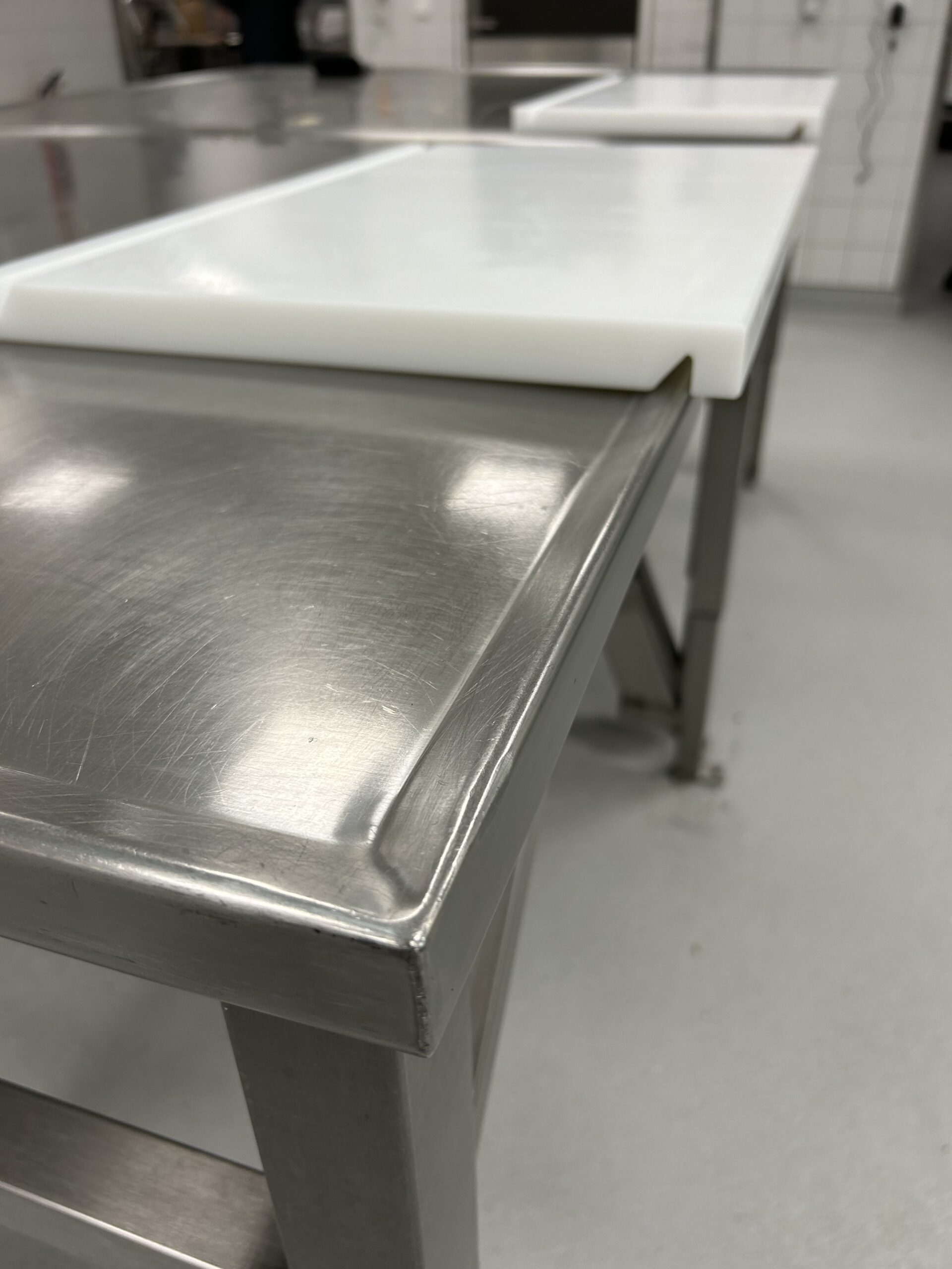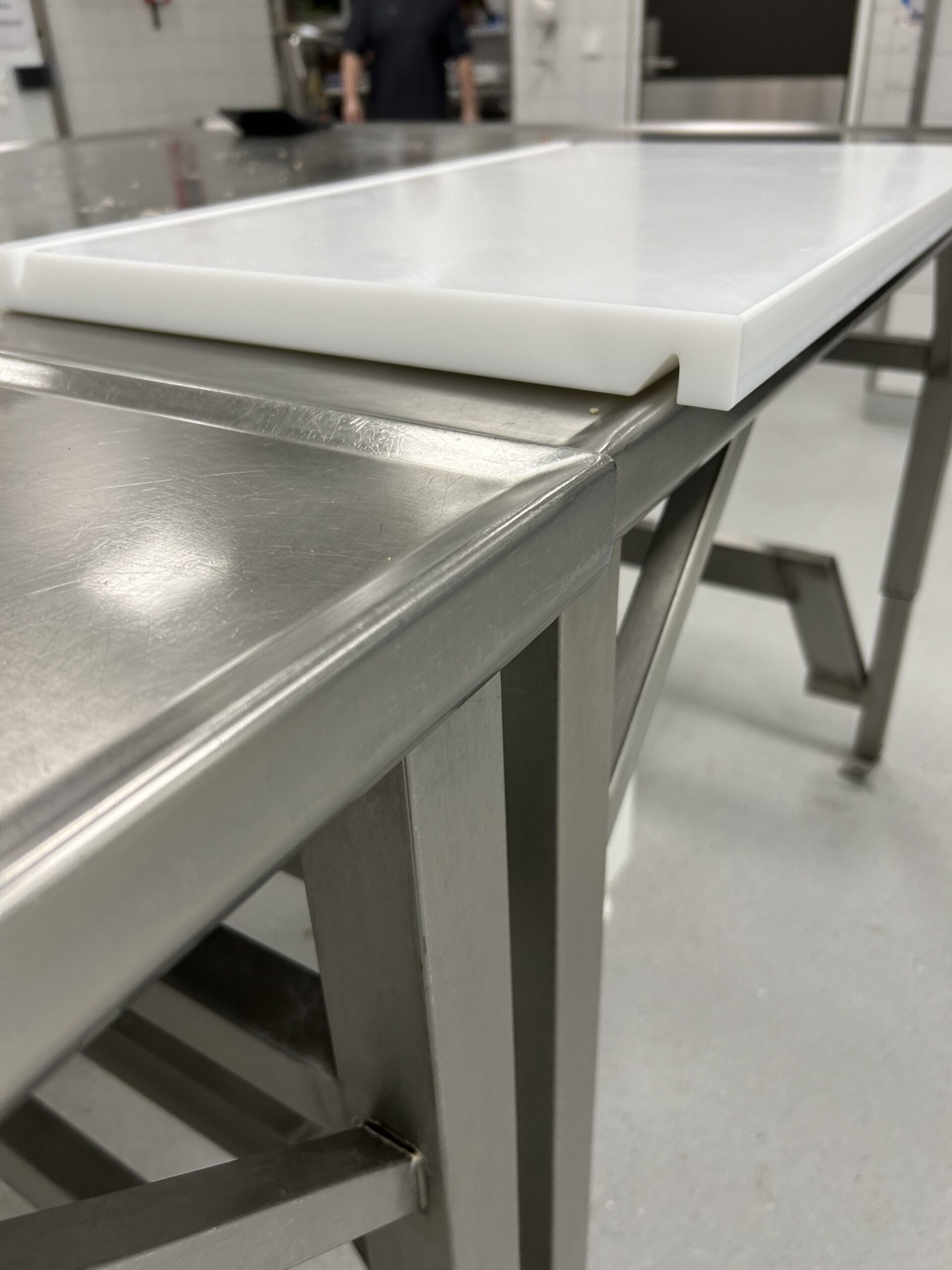 Special fremstillet skærebræt til bord med kant, hvor vi har tilpasset rillen i skærebrættet, således at skærebrættet ligger fast, men nemt kan flyttes rundt til andre stationer. Vi kan lave skærebræt efter mål, som er tilpasset enhver slagter, catering firma. Disse skærebræt er produceret efter branchens bedste materialer. Vi producere kun i den man kalder pe500. Der er mange billigere produkter på markedet, men de holder ikke til daglig slid, og får hurtigt ridser og revner, som gør at skærebrættet ikke kan vaskes ren, og bakterier sætter sig i det, og bliver med tiden dårlig. Ligeledes tåler dette opvaskemaskine, uden at den bliver blød og dårlig.